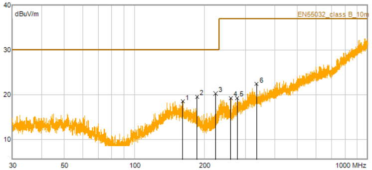 中顯科技YY系列串口屏采取了有效的輻射發(fā)射抑制措施,全系產(chǎn)品都可以達(dá)到ClassB等級(jí)要求。SDWb、SDWn、SDWa三個(gè)系列的部分型號(hào)串口屏,在不做任何整改措施下也可以達(dá)到ClassB等級(jí)要求,如圖2所示為SDWb070T84T串口屏在裸露狀態(tài)下的測(cè)試數(shù)據(jù)波形。如對(duì)輻射發(fā)射性能有要求的應(yīng)用,歡迎聯(lián)系咨詢!