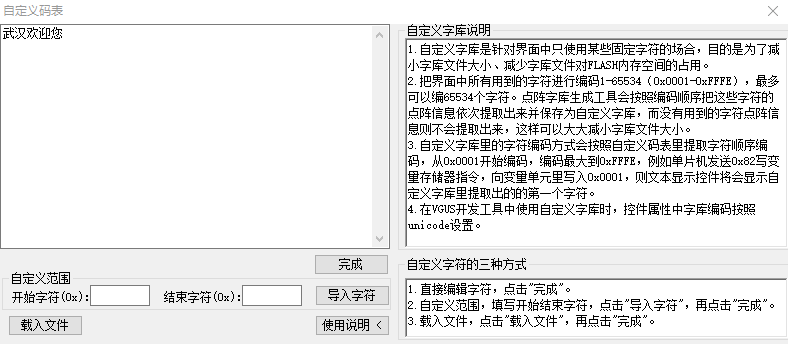 選擇所需字符集,即字庫的編碼方式。可選ASCII、BIG5、GB2312、GBK、SJIS、UNICODE。對于僅需要部分字符的字庫,用戶可自定義編碼表。詳細(xì)使用方法參考《多語種、大容量字庫的應(yīng)用技巧.pdf》。 |