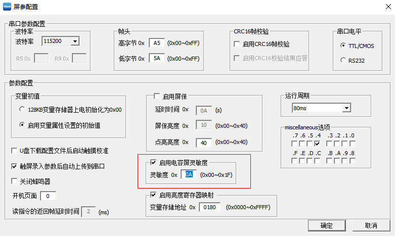 如圖1所示,在VGUS開發(fā)工具的“屏參配置”中,勾選“啟用電容屏靈敏度”,并設置靈敏度值。靈敏度值設置范圍0x00-0x1F,值越大,靈敏度越高。對應的用戶可增加亞克力或鋼化玻璃面板越厚。用戶可根據(jù)實際情況進行靈活調(diào)整。