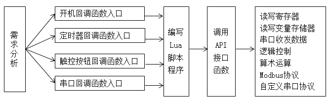 用戶根據(jù)應(yīng)用需要,在回調(diào)函數(shù)里編寫Lua腳本程序,并下載到串口屏里。串口屏?xí)鶕?jù)回調(diào)函數(shù)類型,在不同的時(shí)間點(diǎn)執(zhí)行對(duì)應(yīng)回調(diào)函數(shù)里面的用戶Lua腳本程序。